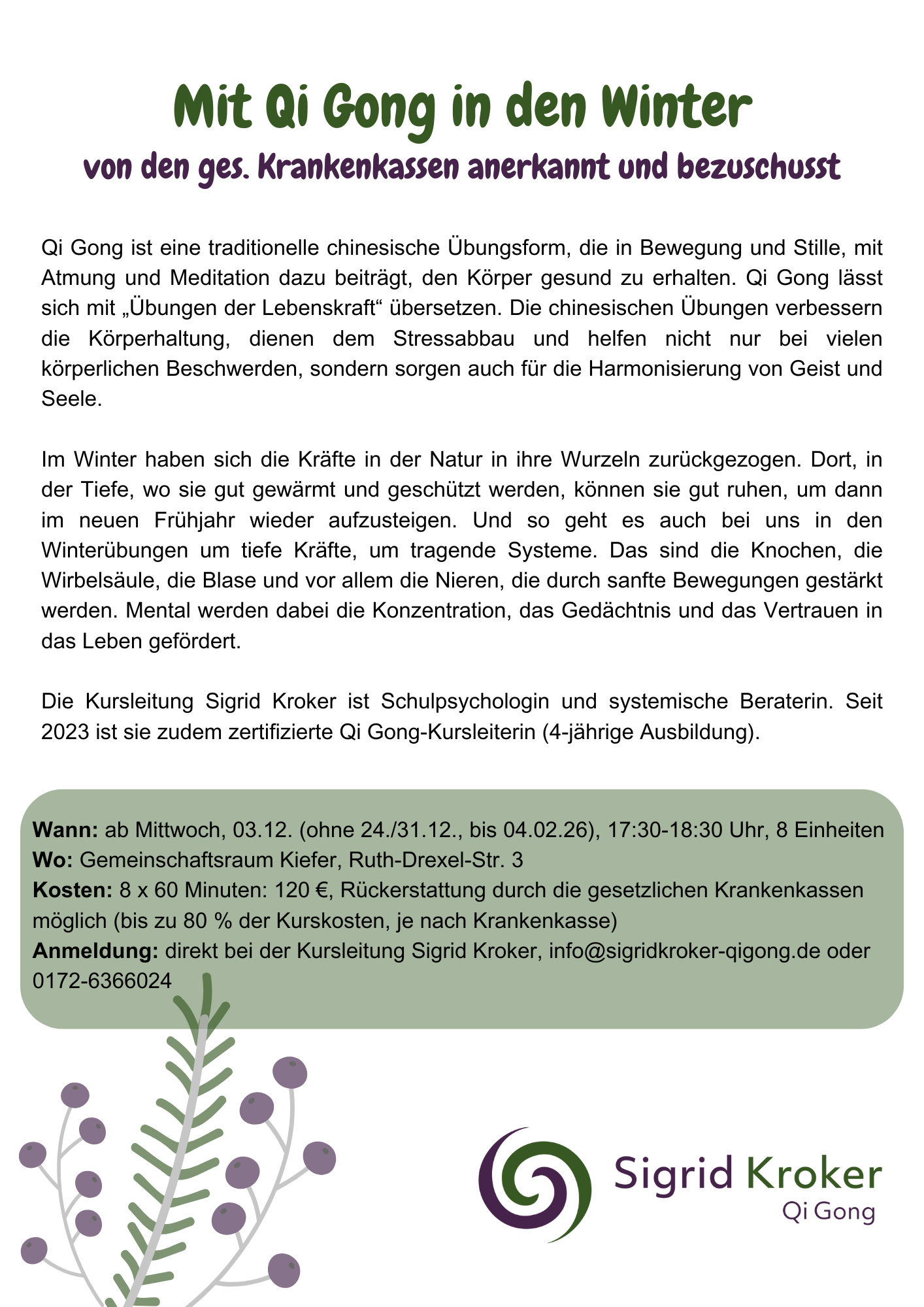 Wenn die aktuellen Kurse schon gestartet oder ausgebucht sind, nimm gerne Kontakt mit mir auf (info@sigridkroker-qigong.de) und ich informiere dich unverbindlich, wenn ein neuer Kurs startet.