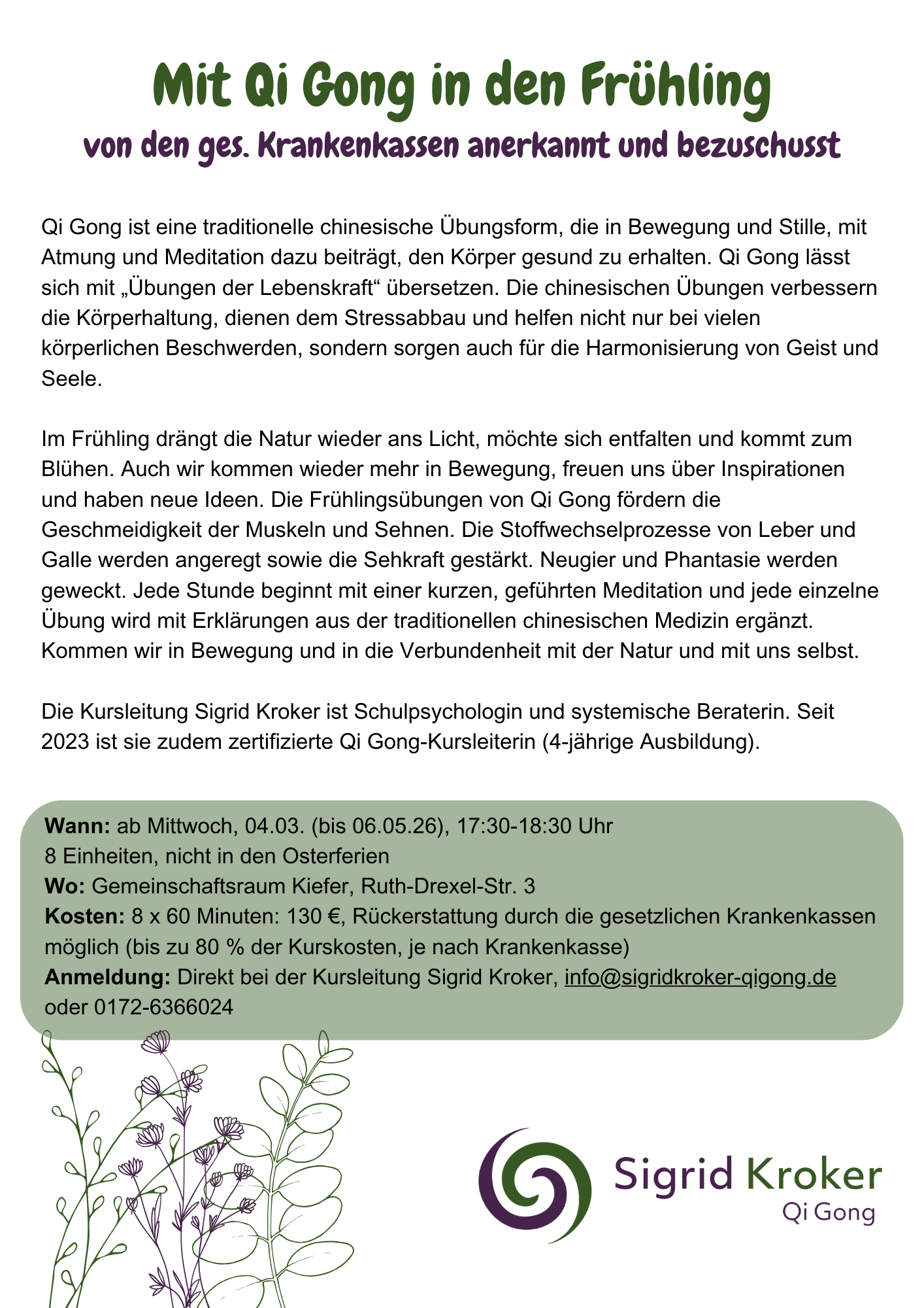 Anmeldung: info@sigridkroker-qigong.de / 0172-6366024